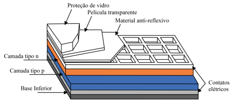 Uma célula PV típica consiste em várias camadas, cada uma desempenhando um papel crucial na geração de eletricidade. Abaixo está um diagrama simplificado (Figura 1) de uma célula PV baseada em silício: